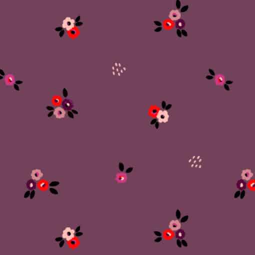 Des petites fleurs éparses rose, rouge et violet s’étalent sur un fond au ton aubergine. Le plumetis de cette viscose apporte texture et relief. Un motif doux qui invite à la rêverie. Des petits bouquets pois viennent rappeler ce monde magique.